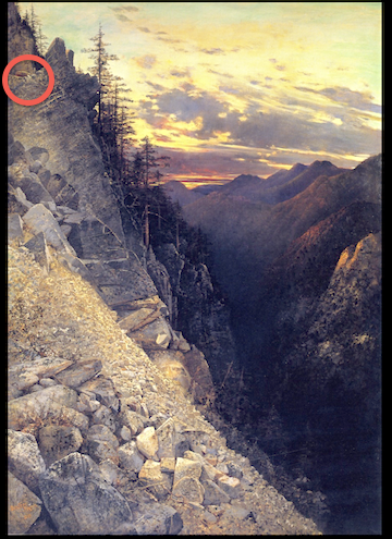 The painting features intricate geological details hidden in the soft twilight of sunset. The longer you look, the more you see. But even standing close up, you’ll have a hard time making out the minuscule Mt. Lowe railroad car chugging through Granite Gate in the upper left hand corner of the painting.
