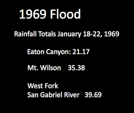 Those were pretty big gully-washers, but the 1969 flood may have been the proverbial “flood of the century!” The 39.69 inches of rain that fell at the West Fork of the San Gabriel River continues to hold the record for the most accumulation in a three day period.