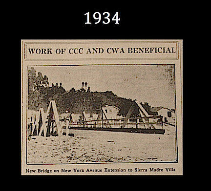 The New York Avenue extension bridge was finished soon after the La Crescenta Valley flood. Built by the WPA, it crossed Eaton Canyon wash to connect New York Drive to Sierra Madre Drive.