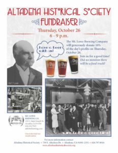 On Thursday, October 26, The Mt. Lowe Brewing Company will donate 10% of the day’s profits to the Altadena Historical Society. Buy yourself a craft beer between 6 and 9 pm and help AHS.(Check out the food trucks, too!)