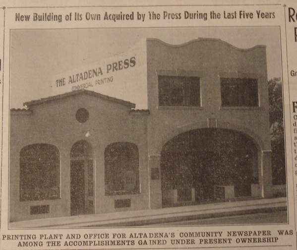 The mammoth press was installed at Altadena Press, 750 E. Mariposa (today the building west of liquor store on south side of Mariposa), on Thursday, August 26, 1937. This is what the building looked like in 1937.